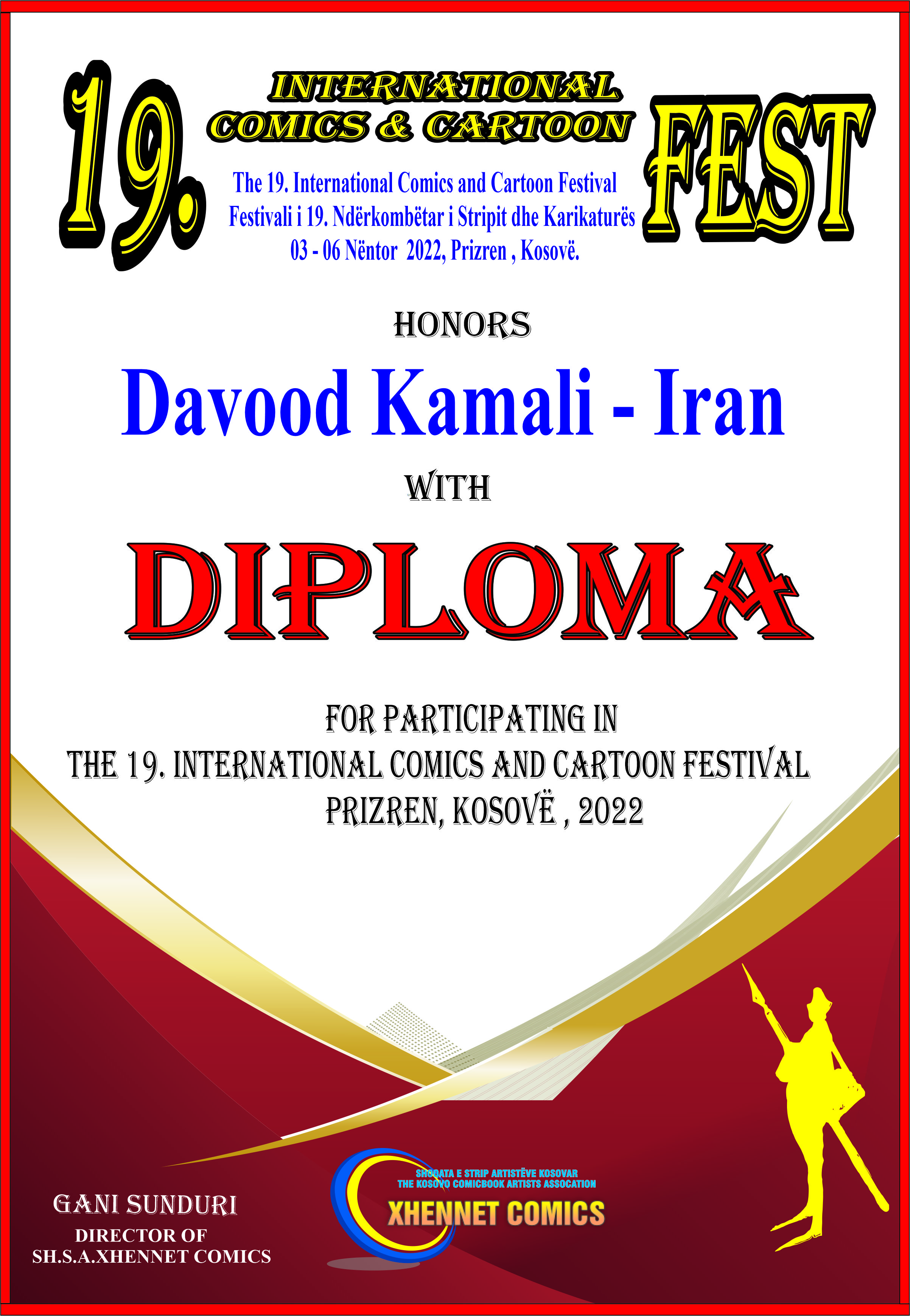 DIPLOMA FOR PARTICIPATING IN THE 19. INTERNATIONAL COMICS AND CARTOON FESTIVAL PRIZREN, KOSOVË, 2022